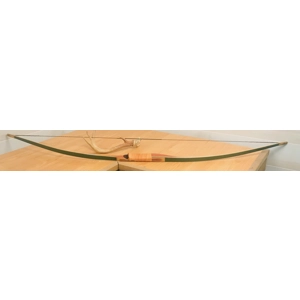 NEW SAFARI LONGBOW. RIGHT HAND - 37 POUNDS AT 28 INCH, 66 INCH STRING GROOVE TO STRING GROOVE. BAMBOO LAMINATIONS WITH GREEN GLASS, TAN OVERLAYS. BUBINGA RISER WITH BUFFALO LEATHER GRIP.